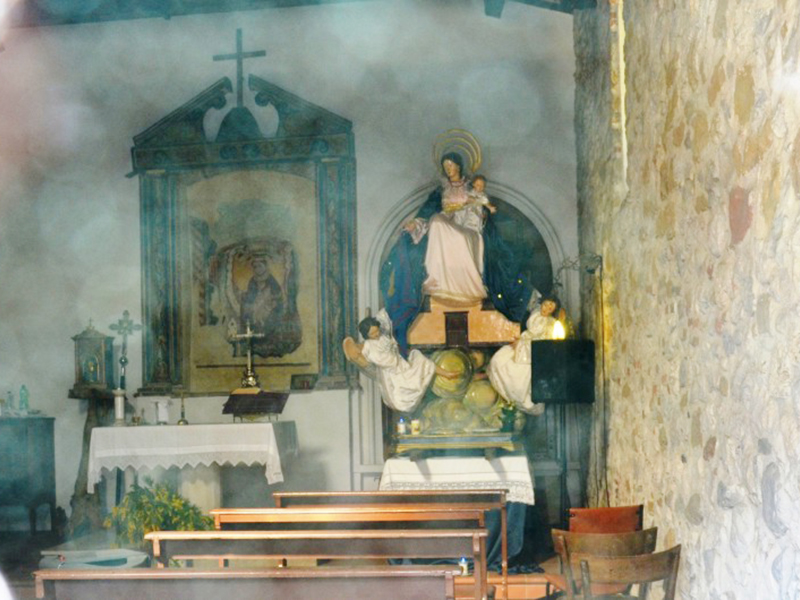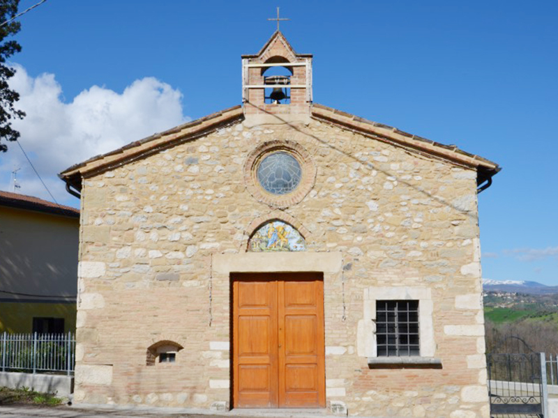 Si tratta di una struttura seicentesca molto semplice realizzata prevalentemente in pietra, con copertura a capanna e, sorgente dalla facciata, piccolo campanile a vela per una campana. Questo reca ancora i segni del terribile terremoto aquilano del 6 aprile 2009 ed è tuttora imbragato con delle centine di sicurezza. Il portale è ad architrave piano sormontato da una lunetta che dal 2008 ospita un mosaico costituito da 16 mattonelle di maiolica opera di Gino di Giuseppe raffiguranti la Sacra Famiglia. Ai suoi lati sono due finestre, un tempo quasi sicuramente di eguali dimensioni, di cui quella a destra ha architrave piano in pietra e quella a sinistra, notevolmente più piccola, è incorniciata in laterizio con arco ribassato. Più in alto un finestrone rotondo, anch’esso incorniciato in laterizio, dà luce all’interno, dov’è custodita una statua della Madonna con Bambino contornata da Angeli. Questa viene portata trionfalmente in processione in occasione dei solenni festeggiamenti del 10 dicembre di ogni anno. L’interno è ad aula unica che termina con la zona presbiteriale; questa ospita un altare ligneo che reca la data 1777. Nel punto in cui è posizionata la pala d’altare si trova un affresco ancora ben distinguibile raffigurante una Madonna con Bambino, tornato alla luce in uno dei recenti restauri.