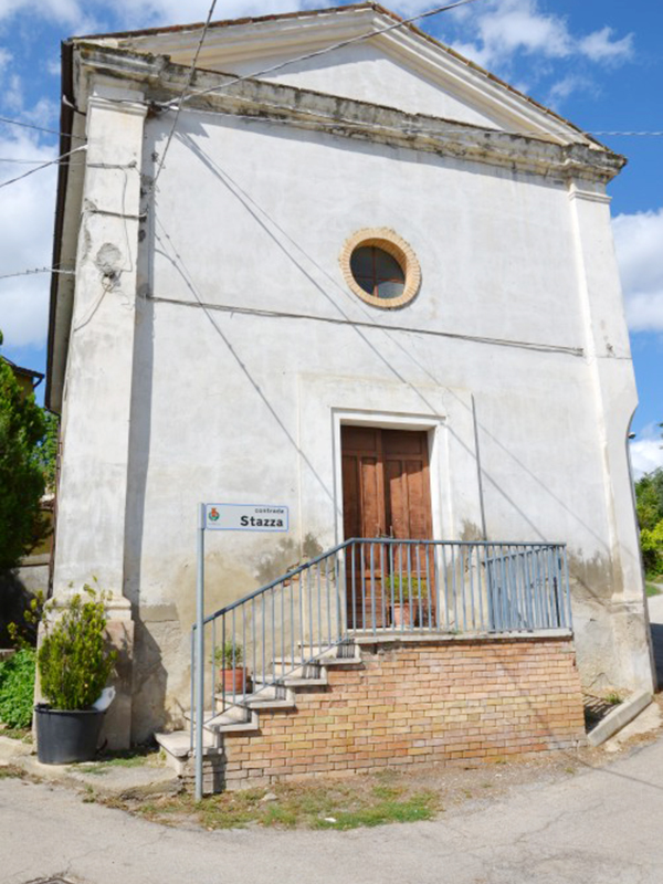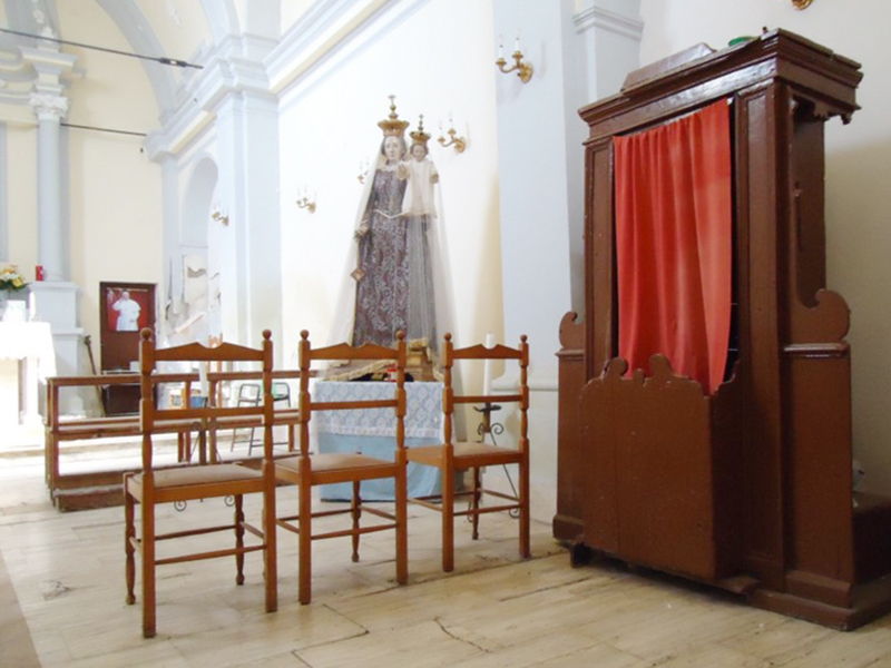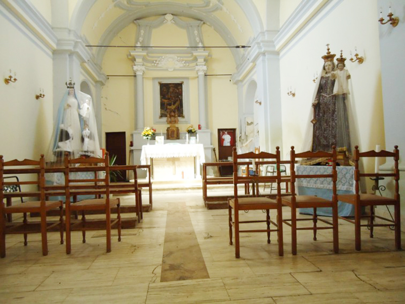 Costruita nel 1868 su una precedente cappella, come ex-voto per avere la Madonna del Carmelo “prontamente liberato” il paese dalla terribile peste del 1855. Ha copertura a capanna ed è sopraelevata di alcuni gradini rispetto al piano stradale. Sulla facciata sormontata da timpano e delimitata da lesene laterali, si apre un semplice portale ad architrave piano e al di sopra di questo è una finestra rotonda, un oculo, incorniciata in laterizio. In corrispondenza della parete posteriore si erge un piccolo campanile a vela in laterizio per una campana. L’interno, che ancora presenta lesioni sul soffitto a seguito del terremoto aquilano del 6 aprile 2009, è ad aula unica divisa in tre campate. In una di queste è la zona presbiteriale, sollevata di un gradino rispetto al resto.