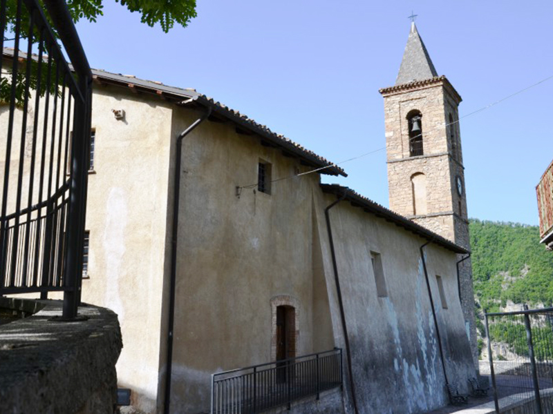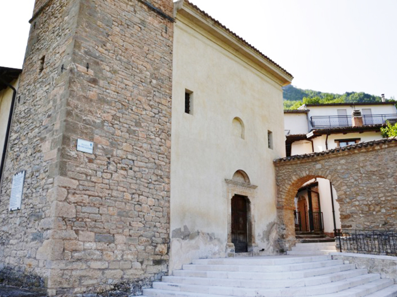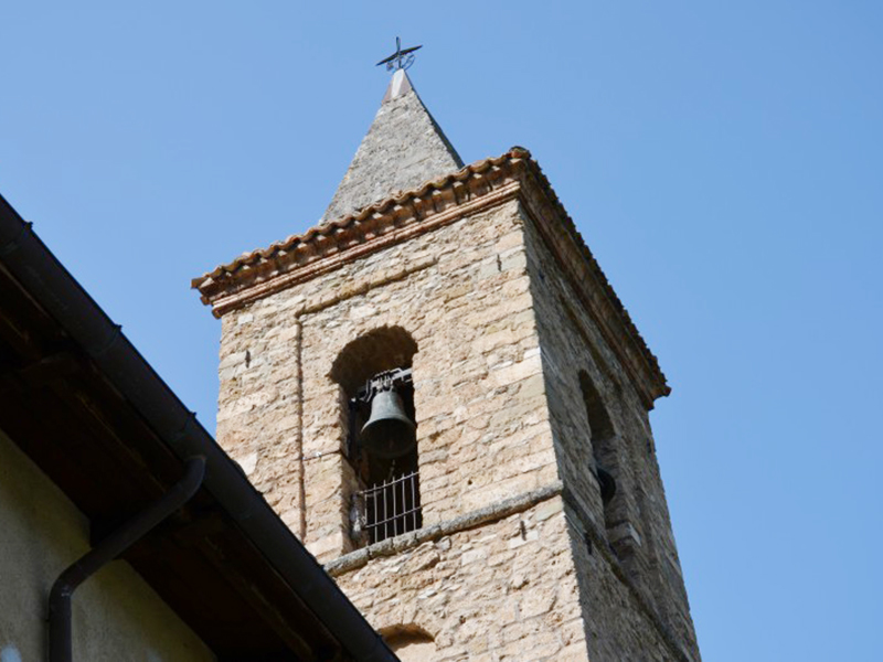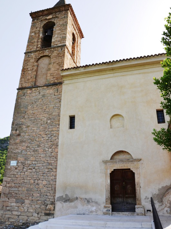 La facciata è a coronamento orizzontale e ad essa si appoggia un’alta torre campanaria che termina a guglia in cui sono alloggiate tre campane. Il portale in pietra è ad architrave piano con mensole terminanti a rocchetto sormontato da una lunetta; sull’architrave si legge su più righe “Quemadmodum desiderat cervus ad fontes aquarum vitae desiderat anima mea ad Te Deus. 1585. Templum Divi Egidii”. La data si riferisce con ogni probabilità a quella di un importante restauro dell’edificio, il cui corpo principale dovrebbe risalire almeno al Trecento. Un altro importante intervento alla chiesa era stato fatto nel 1432, disposto da Papa Eugenio IV, quando probabilmente alla struttura iniziale venne affiancata la seconda navata. Ai lati sono due conci di pietra con fregi decorativi di cui quello di destra, una quercia sormontata da una croce scorciata, rappresenta lo stemma di Cerqueto. Nella lunetta si intravedono appena le tracce di un antico affresco. Sulla parte posteriore dell’edificio, la più antica, sono parzialmente murati degli archetti a tutto sesto sostenuti da colonnine, forse parti di una piccola loggia. Appena più su è murato lo stemma del borbone Gabriele Yllane De Castro, nominato nel 1586 dal marchese Gonsalvo di Alarcón y Mendoza a governare questo lontano lembo del Regno.