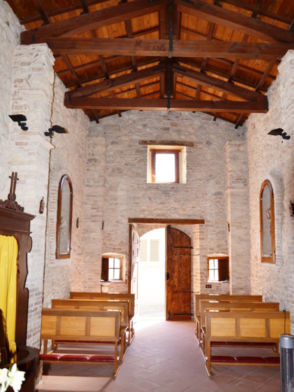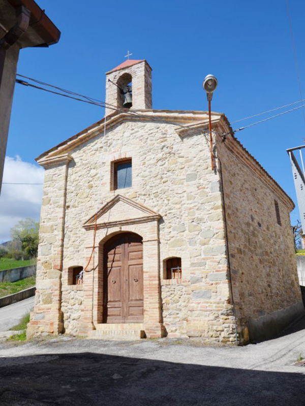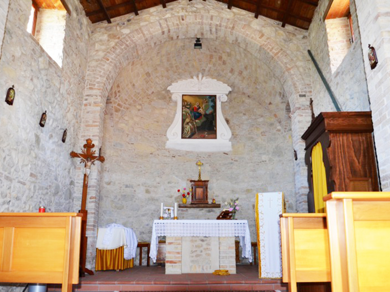 Sul suo originario assetto medievale sono intervenuti nel tempo rifacimenti e restauri, dai cui effetti modificativi è scaturito l’attuale edificio. L’ultimo restauro ha anche sapientemente recuperato il fascino e l’atmosfera medievali con la messa a nudo delle pareti in pietra. L’edificio è in pietra con copertura a capanna; sulla semplice facciata si apre un portale ad arco ribassato incorniciato da colonne in laterizio sormontate da timpano. Ai suoi lati due caratteristiche finestrelle quadrate e in alto un analogo finestrone rettangolare. Dalla cuspide del tetto si erge un piccolo campanile a vela che ospita una campana. L’interno è ad aula unica che termina in un’abside, diviso dal resto della chiesa da un arcone a tutto sesto. La copertura è con capriate in legno a vista e per la parte muraria non mancano spunti di interesse puramente ingegneristico. L’acquasantiera nei pressi dell’ingresso è sorretta da una piccola stele sormontata da un capitello con quattro leoncini alati agli angoli.