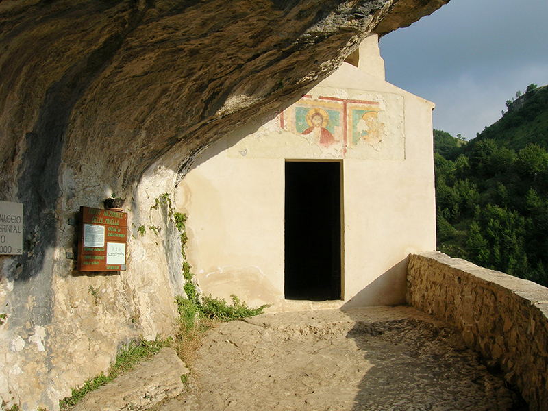 Non ne conosciamo con precisione la data di origine, anche se è logico supporre che il luogo di culto sia anteriore al Mille, ma sappiamo con certezza che fu ricostruito nel XIII secolo da Pietro da Morrone. La presenza di acqua nel riparo e la sorgente nel sottostante vallone, hanno determinato una sua frequentazione in periodi antecedenti che non lasciano dubbi, a tal proposito, le recenti scoperte nel sottostante riparo E. de Pompeis. La ricchissima industria litica e i notevoli resti di macellazione appartengono infatti alle tribù di cacciatori-raccoglitori del paleolitico superiore. Il luogo di culto è frequentato dai devoti dei vicini paesi soprattutto in occasione della processione del 25 di Agosto. Numerosi ex-voto ornano le pareti della chiesetta rupestre a testimonianza di un culto ancora oggi molto vivo. Sono evidenti, nella raccolta da parte dei fedeli dell'acqua che percola all'interno del luogo sacro, un antico culto delle acque e, nell'offerta ed esposizione di taralli, i resti di un rito agricolo. Molti dei luoghi circostanti l'Eremo, quali la sorgente e il ponte, sono legati nelle leggende locali, alla figura del Santo.