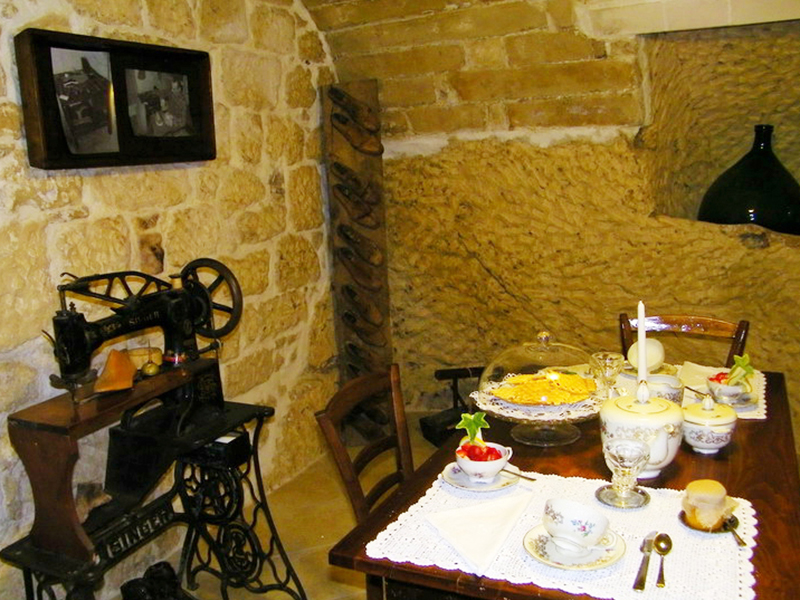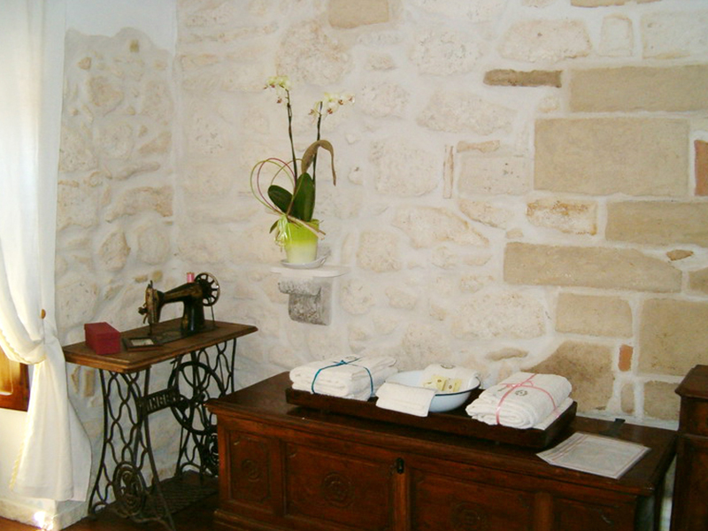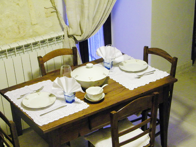 La taverna ci accoglie calorosamente come in un rifugio grazie all'intimo abbraccio esercitato dalle pareti in pietra e dal suo soffitto a volta costituito dai tipici tasselli: mattoni in pietra creati manualmente ad uno ad uno dagli antichi scalpellini del paese. La camera da letto è accessibile dalla cucina attraverso tre scalini. E' l'unica stanza in cui le pareti sono in parte rifinite ad intonaco per creare un contrasto con le scelte di arredo più rispondenti allo stile delle classiche abitazioni rurali. Gli arredi sono di autentico antiquariato.