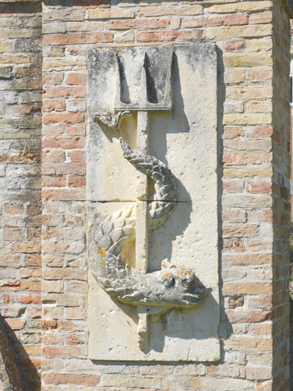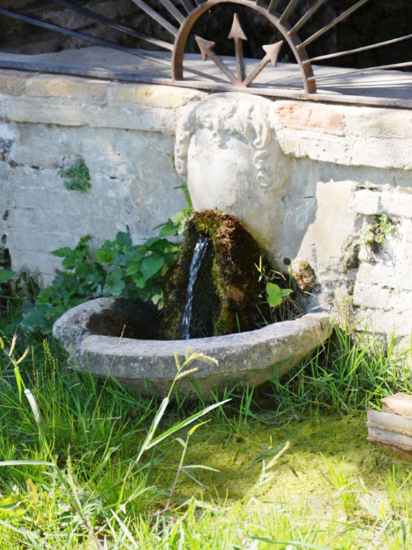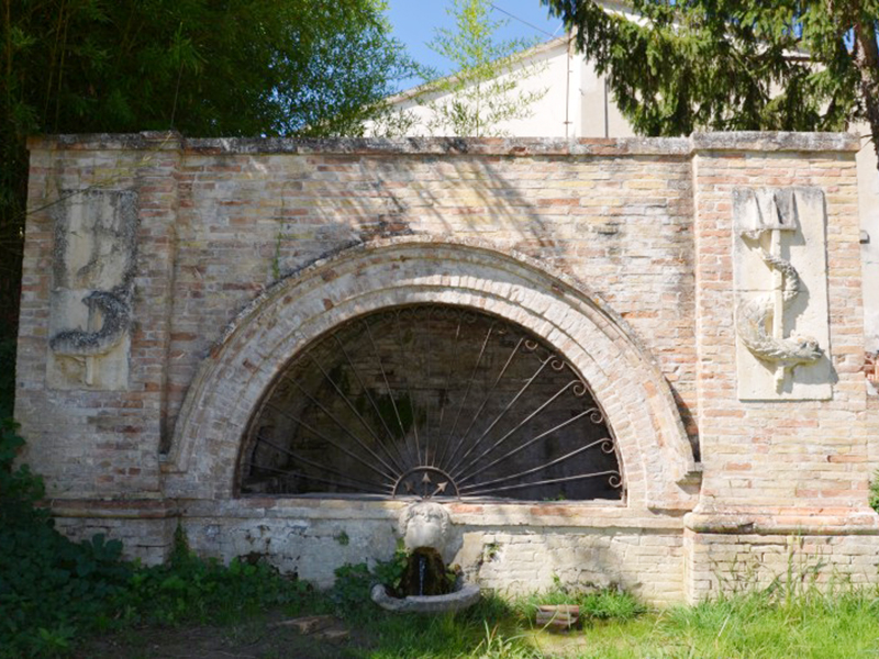 Completamente in mattoni, è databile al Cinquecento. La fonte vera e propria è incassata in una nicchia e la costruzione è caratterizzata da un arco a tutto sesto che poggia su un parapetto al centro del quale è un mascherone che getta acqua in un piccolo catino. Su ognuna delle due colonnine laterali, anch'esse in laterizio, è una lapide su cui è rappresentato a rilievo un tritone attorcigliato ad un tridente.