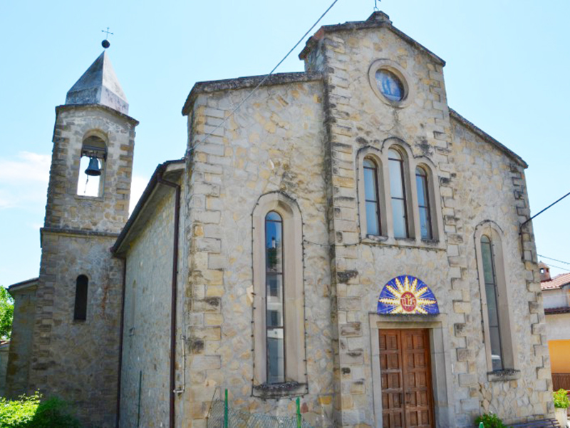 Nota in documenti già nel 1324, è stata largamente rimaneggiata nel tempo ed oggi si presenta con una imponente facciata di cui la parte centrale è sporgente rispetto al resto. Questa parte comprende un oculo, tre finestroni con arco a tutto sesto ed un portale ad architrave piano sormontato da una lunetta. Le parti laterali della facciata contengono ciascuna un finestrone stretto ed alto, anch’esso con arco a tutto sesto. La copertura è a capanna e sul fianco destro è rimesso in opera un architrave in arenaria, forse appartenuto all’edificio preesistente, che in cartiglio reca scritte miste in latino ed in volgare. Queste, aggiunte le lettere mancanti, sono state così interpretate dagli studiosi: “IHS – Iacta cogitatum in Deo et Ipse te enutriet” (Gesù, riversa il pensiero in Dio ed Egli stesso ti nutrirà); “Mentem sanctam spontaneam ad honorem Deo et patrie liberationem” (Una mente santa e spontanea ad onore di Dio e per la liberazione della patria); “Meglio e pigliate prima el bon consiglio” (E’ meglio che prima prendiate il buon consiglio). Gli stessi studiosi fanno risalire queste scritte alla fine del XII secolo. Al fianco sinistro si appoggia invece una torre campanaria a base quadrata dov’è alloggiata una campana.