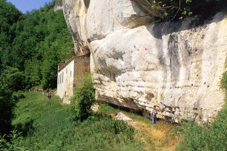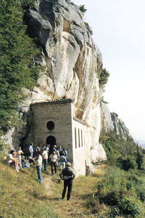 Probabilmente nacque come luogo di ritiro per i monaci di S. Liberatore, per poi divenire una grancia della Badia, dove si curavano gli interessi agricoli e pastorali della stessa. Non abbiamo elementi che ci consentano una sua sicura datazione, e dobbiamo limitarci ad ipotizzare che il luogo di culto sia nato nel lungo arco di tempo che va dall'XI al XIV secolo, epoca fiorente per la Badia e per tutta la vita religiosa della Majella. Le popolazioni locali si recano all'Eremo il 12 Giugno percorrendo il sentiero lungo il quale, secondo la tradizione locale, il Santo aveva lasciato le proprie impronte impresse sulla roccia. All'interno della grotta, dietro l'altare, non รจ raro vedere i fedeli coricarsi nella "Culla di Sant'Onofrio": con l'antico rito della litoterapia i devoti curano i mali di pancia e le febbri ostinate.