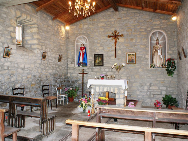Fu edificata nel 1803, com’è scritto sul semplice portale, ed oggi porta gli evidenti segni dei danni infertigli dal terremoto del 6 aprile 2009. E’ con tetto a capanna, ristrutturato nel 1988, e con un piccolo campanile a vela che ospita una campana. Su di essa è decorata una Madonna con Bambino e Crocifisso ed è leggibile la scritta “A fulgure et tempestate libera nos Domine – A.D. 1773”, cioè “Liberaci o Signore dalla folgore e dalla tempesta – Anno 1773”. L’interno è costituito da un’unica piccola aula con copertura lignea, sulla cui parete dietro l’altare trovano posto in altrettante nicchie due statue raffiguranti la Madonna.