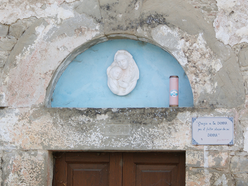 Nell’ampia e pulita piazzetta si affaccia un chiesa minuscola ed antica, dall’intonaco cadente e da mura costruite con grosse pietre fissate con poca malta: dedicata alla Madonna, vi si veneravano anche S. Andrea e S. Lucia. Purtroppo divenuta fatiscente e gravemente lesionata dal terremoto del 6 aprile 2009 è oggi inagibile e le statue dei due santi che vi si veneravano si trovano nella più grande ed accogliente chiesa parrocchiale di Faieto. Sull’architrave del portale si legge la data 1631; nella nicchia soprastante trova posto una piccola effigie in terracotta della Madonna con Bambino. Di fianco, su una mattonella in ceramica è riportata una frase di Papa Paolo Giovanni II lì apposta nel 1995 e dedicata alla Madonna: “Grazie a Te DONNA per il fatto stesso che sei DONNA”. Con copertura a capanna sostenuta da un solaio in cemento armato di dubbio gusto, frutto di un recente restauro, ha un piccolo campanile a vela che sostiene una campana. L’interno è costituito da un’unica piccola aula priva di abside.