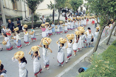 Il popolo di Serramonacesca attribuisce la tradizione dei miejie, gli Omaggi, la prima domenica di settembre a Sant'Antonio di Padova, detto in paese Sant'Antoniucce, per le modeste dimensioni di una artistica ed antica statua a cui è riferita la devozione popolare. Gli omaggi consistono in trofei vegetali, realizzati ricoprendo una struttura di canne a forma conica, con rami di felci, e sopra i quali vengono appesi gli oggetti che si intendono donare alla chiesa per contribuire alle spese della festa. Quasi ogni famiglia si impegna nella realizzazione di un miejie che, issato su una lunga pertica, viene recato solennemente e con gran seguito di pubblico di fronte al sagrato. Il trofeo può essere anche semplicemente un grosso ramo verde e biforcuto da cui pendono i doni, i quali sono di varia natura: da prodotti alimentari, come confezioni di pasta, a specialità gastronomiche e dolciarie e a produzioni tipiche del luogo. Tutto è deposto fuori la porta della chiesa, durante la messa solenne delle undici e prima della processione, conclusa la quale gli omaggi vengono posti all'asta. Un banditore, ricorrendo a tutta la sua arte oratoria e alla sua dialettica, comincia a magnificare i trofei ad uno ad uno, elencando la ricchezza dei doni e la varietà del contenuto. Solitamente sono le stesse famiglie che hanno recato il dono a ricomprarlo a prezzo notevolmente superiore al suo valore reale, tra gli applausi degli astanti e le invocazioni di evviva a Sant'Antonio di Padova.