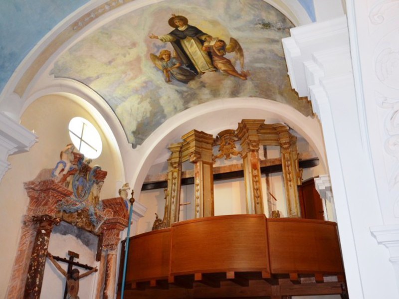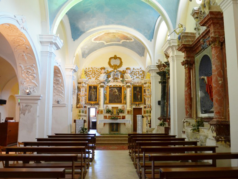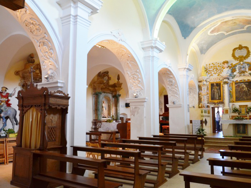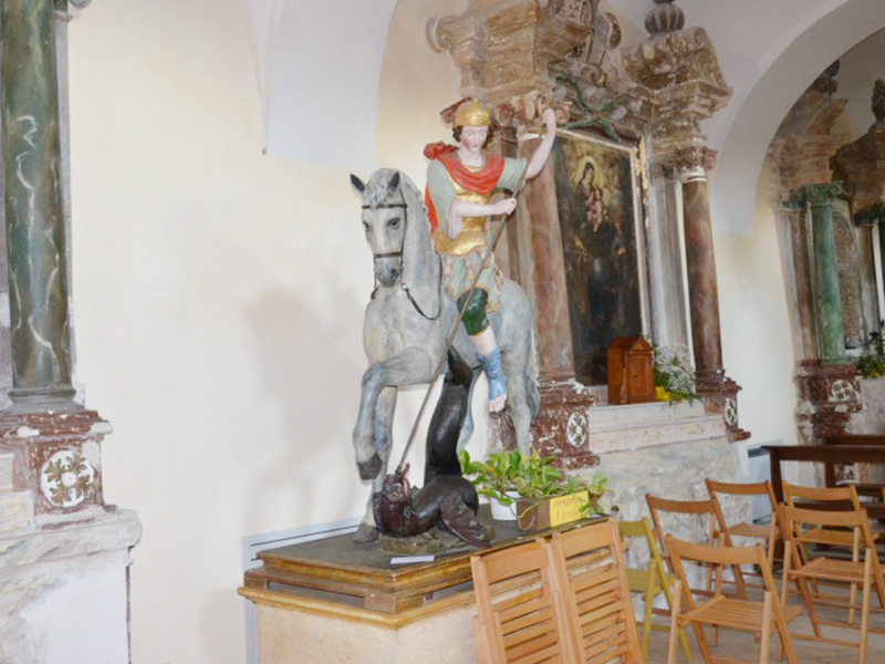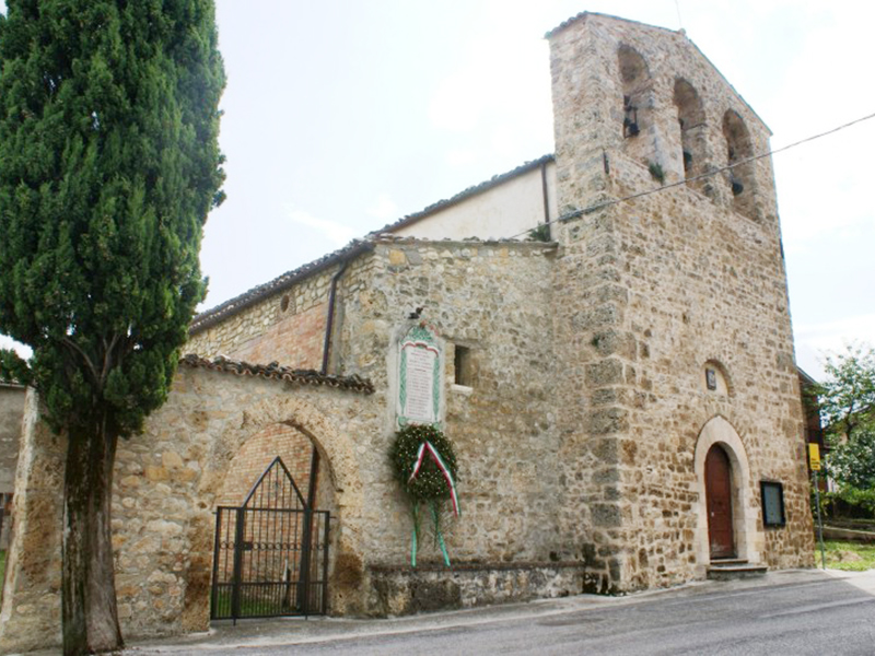 Parrocchiale dall’impianto originario medievale. Ha il tetto a capanna ed in corrispondenza della facciata in pietra si erge un possente campanile a vela che sostiene tre campane, tutte di misure diverse. Nella lunetta sovrastante il portale incorniciato in pietra trova posto una mattonella in maiolica con l’immagine policroma di S.Giorgio che uccide il drago. Nella parete esterna laterale sono state rimesse in opera un’epigrafe romana, una pietra con la data 1774 ed alcuni frammenti di fregi di possibile origine medievale. L’interno risalirebbe alla fine del Seicento e conserva due altari barocchi in parte in legno ed in parte in stucco, di cui quello in fondo alla navata di sinistra è dedicato alla Madonna del Rosario.