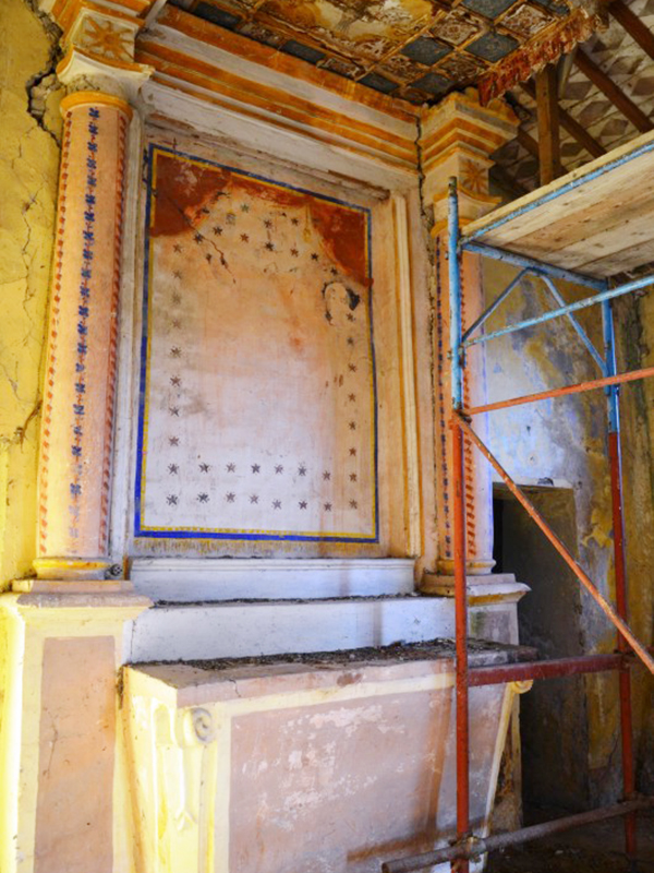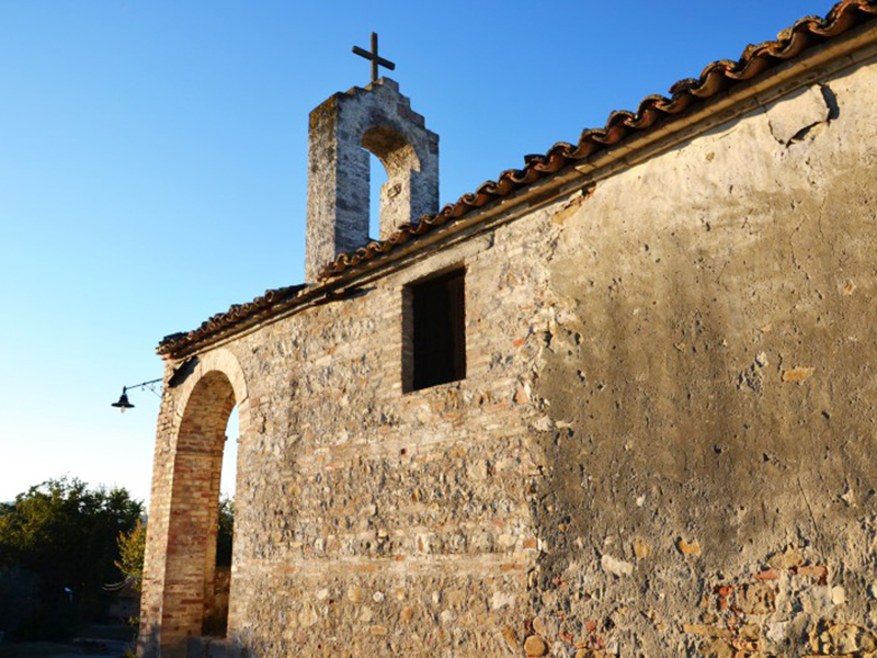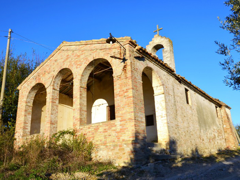 Completamente in laterizio, ha copertura a capanna e il suo semplice portale d'ingresso ad architrave piano è preceduto da un piccolo porticato che presenta quattro archi a tutto sesto. Ai lati dell'ingresso sono due basse finestre quadrate che potrebbero far datare la chiesa al Settecento. Dal tetto si alza un campanile a vela con un fornice ormai senza campana. L'interno, ad aula unica, ha copertura con capriate a vista che sorreggono mattoni dipinti con motivi vari. Della chiesa sopravvive solo un altare in stucco e laterizio sormontato da un baldacchino ligneo decorato.