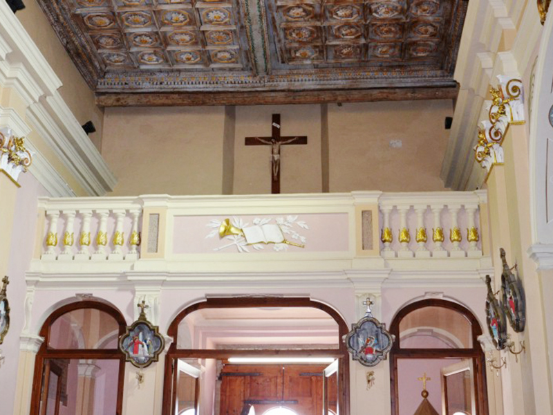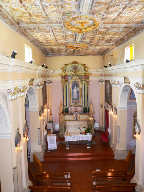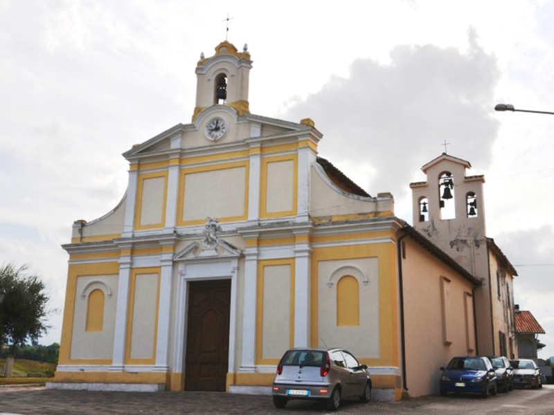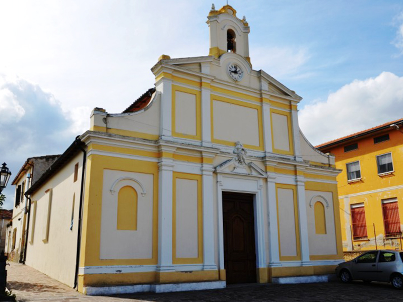 Documentata già nel 1622, venne eretta sui resti di un'altra chiesa, forse dedicata a S.Giacomo, e ristrutturata agli inizi del Novecento. La facciata è marcata da lesene ed è coronata da timpano spezzato; dal centro di questo si alza un piccolo campanile a vela che ospita una campana. Dalla parete posteriore si alza invece un grande campanile a vela a tre fornici con altrettante campane, su ciascuna delle quali è un'iscrizione: sulla prima "Mattucci Nicola 1961"; sulla seconda "A.D. MDCCLXXXV + A fulgure et tempestate libera nos"; sulla terza "Curavit + D. Vincentius A.D. 1695". L'interno è a navata unica con quattro cappelle laterali, due per ogni lato lungo. I due altari di destra sono dedicati l'uno a S.Benigno e l'altro alla Madonna Addolorata, mentre quelli di sinistra sono dedicati al Sacro Cuore ed alla Madonna della Pace. La navata è coperta da un soffitto ligneo a cassettoni del Settecento, decorato con motivi floreali. Al di sopra della porta d'ingresso è la cantoria, nei pressi della quale è sistemato il meccanismo dell'orologio che orna la facciata esterna, realizzato dai "Costruttori meccanici Poli & Bellotti" di Milano.