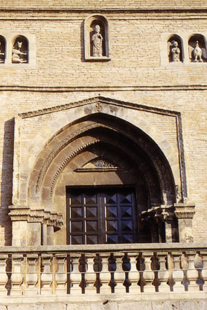 La facciata presenta tre splendidi portali ogivali, di cui quello mediano, a strombo, si caratterizza per l’articolata lavorazione. Lo sovrasta uno spettacolare, luminoso e pregiatissimo rosone angioino a ruota, opera del 1312 della scuola del Petrini di Lanciano. Il rosone, ricco di arcate, colonnine radiali, trafori ecc, è protetto da un archivolto sorretto da colonne pensili poggianti su mensole leonine. Sul rosone, in alto, il simbolo dell’agnello divino. Sulla sommità del timpano viene inserita una cornice curvilinea che si piega sui capitelli delle lesene laterali, da cui partono due volute che si distendono lungo tutto il cornicione sottostante, inglobando le tre navate. L’interno, che negli interventi del XIV sec. era stato definito in tre navate, nel 1852 si arricchisce di altre due navate, divise da pilastri, ed assume l’assetto definitivo a 5 navate. Oggi l’interno si presenta interamente rivestito di decori barocchi. Ai lati dell’abside si trovano due cappelle: a destra la cappella del S.S. Sacramento, con la statua del Sacro Cuore di Gesù nella nicchia centrale che sormonta l’altare, mentre nella nicchia della parete laterale a destra è situata la statua di San Martino di Tours, in quella a sinistra la statua della Vergine Immacolata Concezione. A sinistra dell’abside si trova la cappella di Maria Santissima di Loreto, la cui pregevole statua è custodita nell’edicola che sormonta l’altare, mentre nella parete laterale a destra si trova la nicchia con la statua di San Nicola e nella parete laterale a sinistra quella di Sant’Emidio, compatrono di Atessa. Le pareti laterali della chiesa sono scandite da una serie di tredici altari in marmo, sormontati da quadri ad olio rappresentanti Santi diversi, spesso riconducibili a devozioni particolari, ex voto o lasciti per grazia ricevuta.