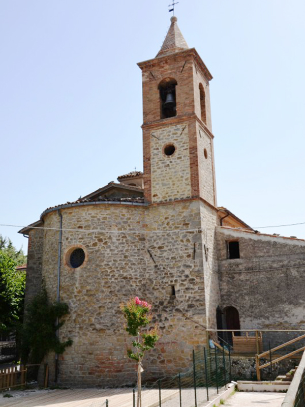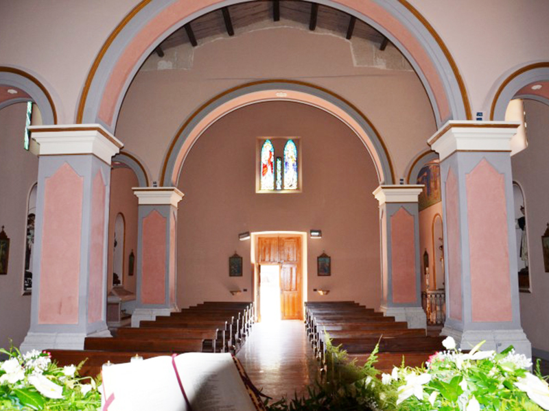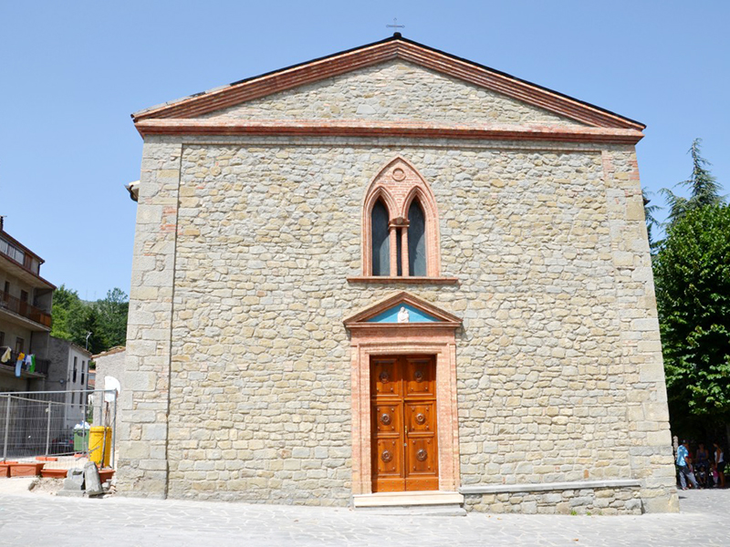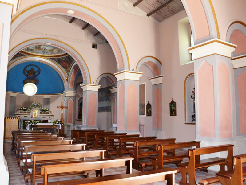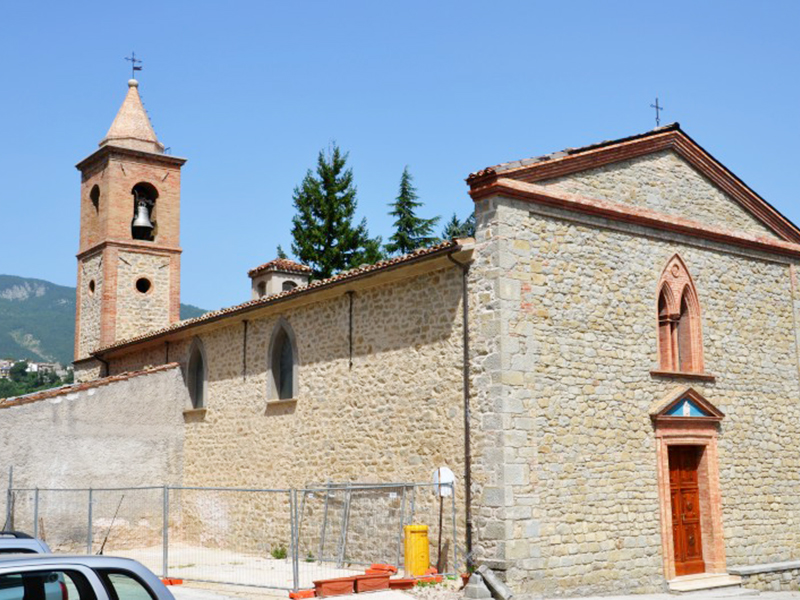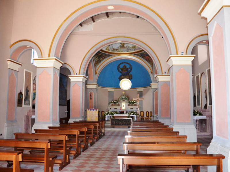 Eretta nel XIX secolo è completamente in pietra e in facciata si apre un semplice portale ad architrave piano incorniciato in laterizio e sovrastato da un timpano, anch’esso in laterizio, all’interno del quale è una statuetta stilizzata di una Madonna con Bambino. Al di sopra del timpano si apre una bifora ad arco acuto. La copertura è a capanna ed alla parete posteriore è poggiata una torre campanaria a base quadrata che sorregge quattro campane. All’interno è un’unica navata divisa in due sezioni da due arconi a tutto sesto poggianti su colonne quadrate. La zona presbiteriale, sopraelevata di un gradino rispetto al resto, è collocata in parte nell’abside e per il resto nella zona antistante; è sormontata da una cupola completamente affrescata ed ha ai suoi lati una balaustrata in marmo.