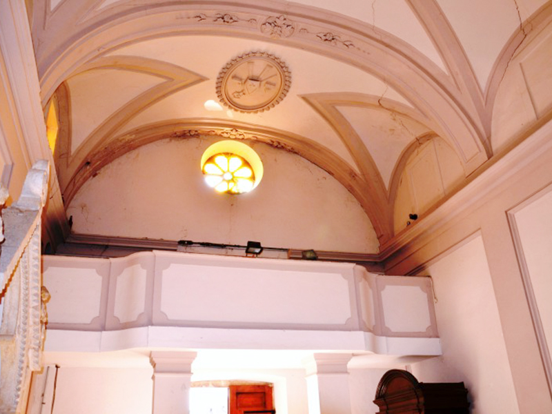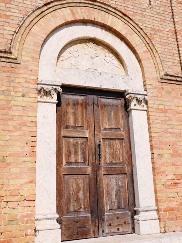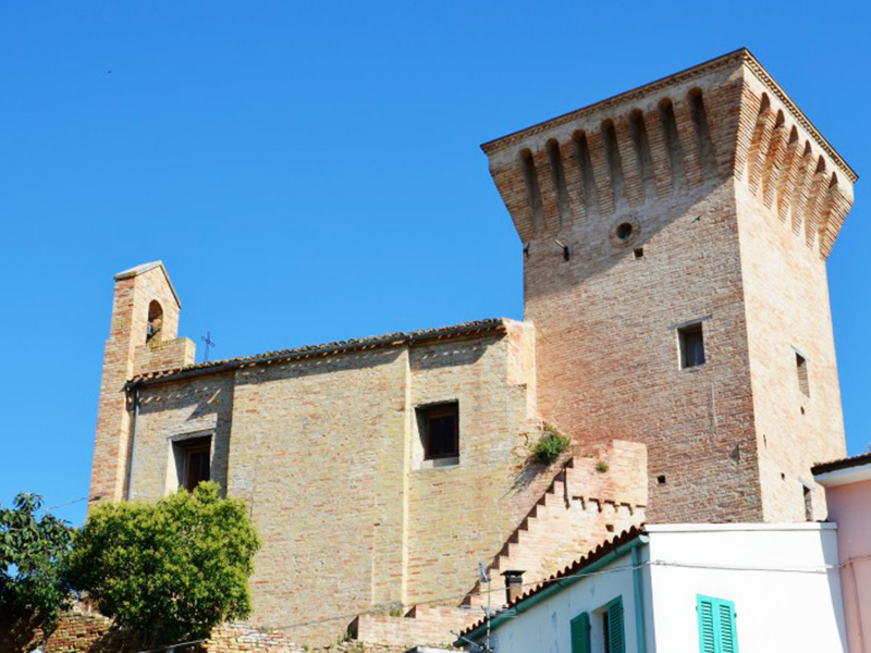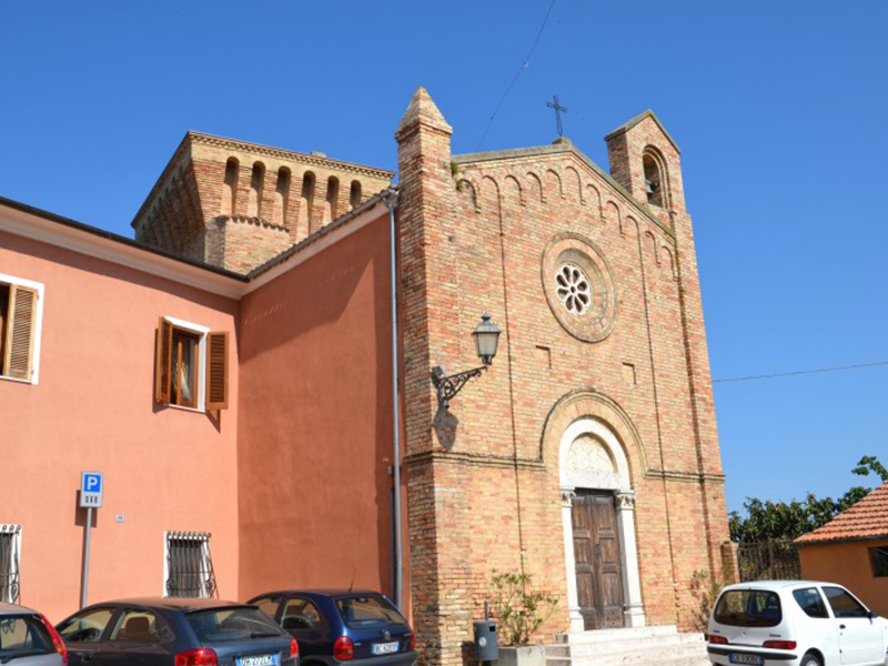 Le fortificazioni vengono fatte risalire almeno al XIII secolo, successivamente potenziate dagli Acquaviva tra il XIV ed il XV secolo. All’inizio del Seicento alla chiesa era annesso un convento di Celestiniani. Sulla facciata, completamente, in laterizio, si apre un grande finestrone rotondo; il portale, preceduto da alcuni scalini, è in pietra ed è sormontato da una lunetta con arco a tutto sesto sostenuta da capitelli con foglie d’acanto. Dalla facciata si erge un piccolo campanile a vela che sorregge una campana. L’interno è costituito da un’unica aula in fondo alla quale è un grande altare. La chiesa custodisce l’interessante monumento sepolcrale di Bucciarello Di Bartolomeo figlio di Giacomo, forse ufficiale al servizio del Conte di Conversano Antonio Acquaviva. Si tratta di un’opera artistica in pietra scolpita di stile gotico, datata 1390 e restaurata nel 1988. Era un tempo collocata nella chiesa di S.Giacomo fuori le mura, ma, dismessa questa, venne trasferita dov’è ora. La parete a vista del sarcofago è impreziosita da cinque colonnine tortili, due bassorilievi con motivi floreali e due stemmi, anch’essi in bassorilievo. Gli studiosi affermano che quello che rappresenta uno scudo sannitico con sostegni floreali recante due gigli e due croci sarebbe lo stemma di famiglia di Bucciarello, mentre l’altro, rappresentato da uno scudo sannitico con sostegni floreali e teste d’angelo sormontato da braccio che impugna una spada, sarebbe lo stemma di famiglia di sua moglie. Due coppie di colonnine tortili sostengono l’arco di copertura del sarcofago finemente lavorato, al cui apice è un bassorilievo con l’Agnus Dei. Su una delle fiancate è incisa in lettere gotiche la scritta (integrata dagli studiosi): Hoc sepulcrum fecit fieri vir nobilis Buciarellus Iacobi Bartholomei de Montono sub anno Domini MCCCLXXXX. Indictione XIIII. In prossimità del monumento è posta impropriamente una scritta lapidea riguardante un evento del 1833.