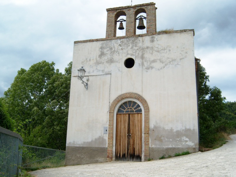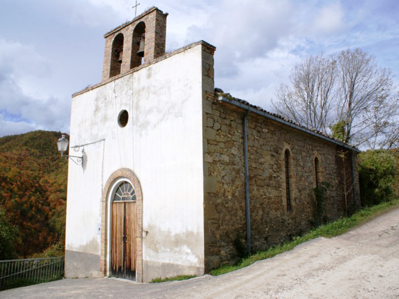 Su un dosso discosto dal centro abitato troviamo la chiesa. Risalente al XIV secolo, molte parti della struttura muraria attuale sono quelle originarie. E’ a facciata quadrata e la copertura del tetto è a capanna; l’interno è ad aula unica e sopra il portone d’ingresso c’è un campanile a vela che sostiene due campane di misure diverse. La frequente presenza del monogramma dei Gesuiti composto dalle lettere IHS (Iesus Hominum Salvator), spesso con l’H sormontata da una croce, incastonato con le date di costruzione delle abitazioni indica la fervente attività di quest’Ordine sul territorio nel Settecento.