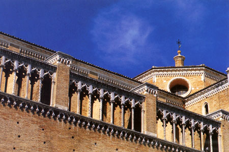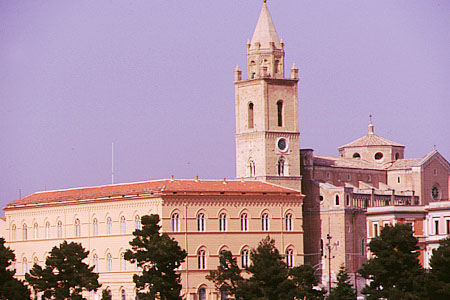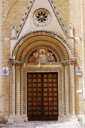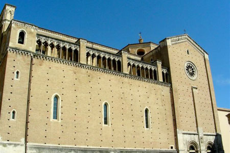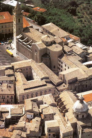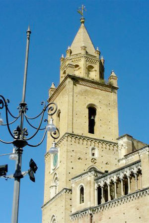 La facciata e il grande portale a cui si accede da un'ampia scalinata sono opera moderna riecheggiante lo stile trecentesco originario delle muraglie e l'architettura pugliese. L'elegante campanile, ornato da bifore ogivali a doppia colonnina centrale è opera di Bartolomeo di Giacomo (1335), mentre la cella campanaria si deve ad Antonio da Lodi (1498). L'interno, a croce latina, si presenta a tre navate scandite da pilastri. Il transetto e il presbiterio hanno una posizione sopraelevata che conferisce un tono solenne alla sontuosità barocca dell'insieme. Cominciando la visita dalla navata destra si segnalano il fonte battesimale (1599), la cappella della Addolorata (abside destra) con paliotto marmoreo di arte napoletana (sec. XVII) in mezzo al quale è incastonata una piccola immagine in pietra di San Giustino. Continuando a sinistra si incontrano, nell'abside, l'altare di San Giustino e in fondo la cappella del Sacramento. L'altar maggiore è ornato da un artistico paliotto di marmo con San Giustino eremita che riceve le insegne episcopali dal popolo di Teate. Nell'abside centrale sono collocati un coro di legno intagliato (sec. XVII) e una grande pala raffigurante l'Incredulità di San Tommaso, attribuita alla scuola napoletana di Giuseppe Sammartino (sec. XVIII). Due scale immettono alla cripta posta sotto il presbiterio, che è a navate irregolari e presenta la struttura romanica riportata alla luce da un recente restauro. Sulle pareti frammenti lapidei di varia origine e tracce di affreschi medioevali. Sempre dalla cripta si può accedere alla sontuosa cappella del Suffragio, sede dell'Arciconfraternita del Monte dei Morti, a cui spetta, tra l'altro, l'organizzazione della spettacolare e storica processione del Venerdì Santo.