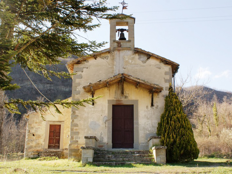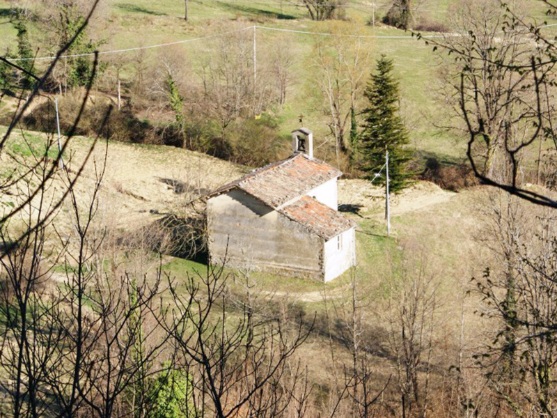 Venne edificata verso la metà dell’Ottocento e poi totalmente ristrutturata nel 1935 quando le autorità fasciste locali ebbero grande interesse a mettere in mostra quanto di buono sapessero fare sul territorio. La chiesa, realizzata in laterizio e pietra, si presenta con copertura a capanna e piccolo campanile a vela, ove è collocata una campana, in corrispondenza della facciata. Alla parte posteriore della parete sinistra è appoggiato un piccolo corpo di fabbrica che costituiva la casa canonica ed alcuni gradini consentono di giungere al piano, che risulta rialzato rispetto a quello di campagna. La facciata è semplice, con numerosi segni di riparazioni effettuate in momenti successivi, e vi si apre un portaletto in pietra arenaria con architrave piano. Una ormai fatiscente tettoia in legno e laterizi tenta di proteggere il portale dalle intemperie e gli ammorsamenti angolari sono a vista.