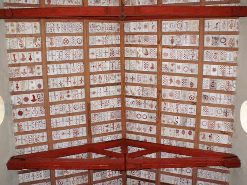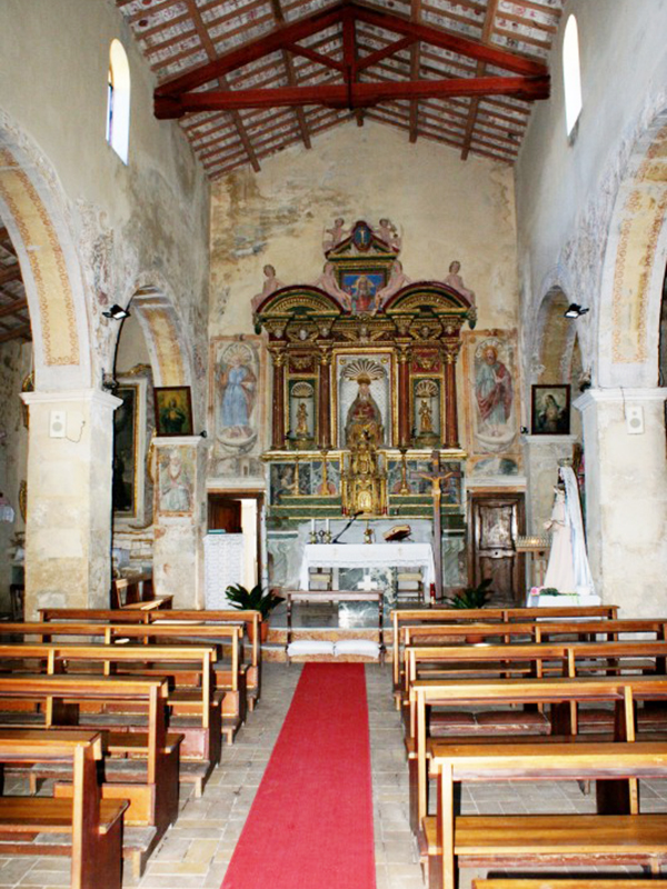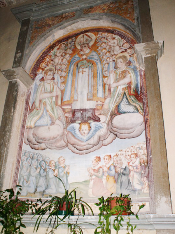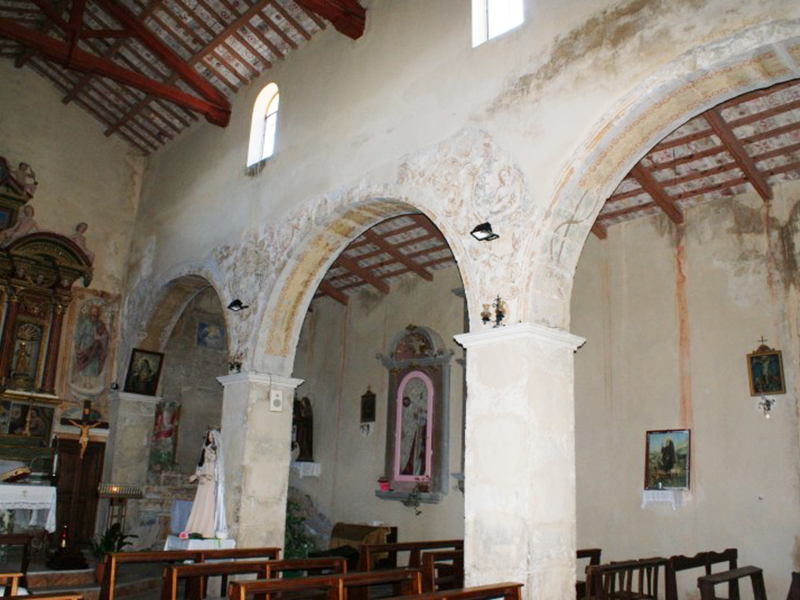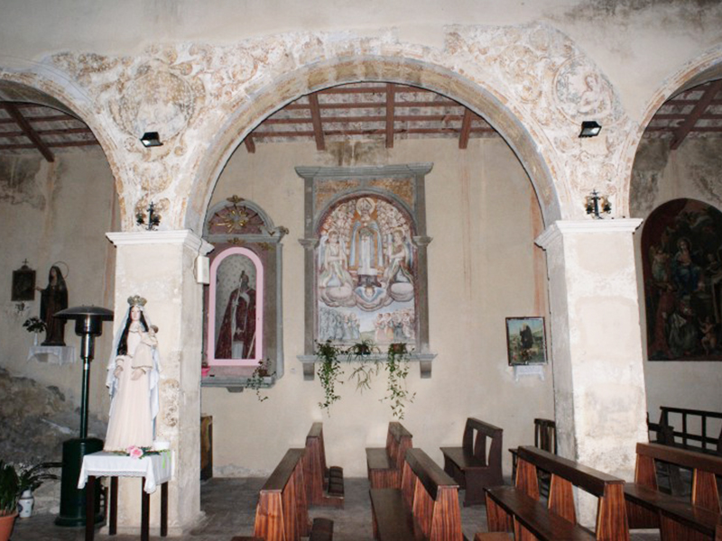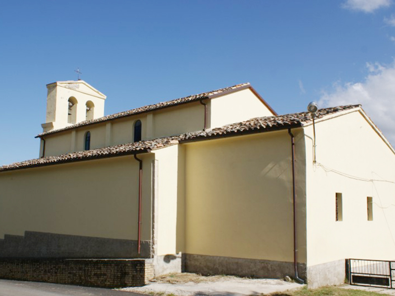 La sua costruzione risalirebbe alla fine del Cinquecento, restaurata poi nel Settecento. Ha copertura a capanna ed in corrispondenza della facciata si erge un campanile a vela che sorregge due campane. Ha un bel portale in pietra appartenuto alla costruzione originaria; presenta cornice specchiata sovrastata da un timpano e all’interno di questo si trova, danneggiato ma ancora visibile, un affresco con una Madonna con Bambino affiancata da due Angeli. La raffigurazione è sormontata dalla scritta “Questa fegura la fece Filippo et Valentino Forti per loro devotione – 1632”. Appena sotto il timpano si legge “Verbum caro factum est et habitavit in nobis. Assumpta est Maria in coelum gaude(n)t angeli lauda(n)tes Dominum”. Nel corpo di fabbrica posteriore su una mattonella incastonata al muro è incisa la data 1729, mentre in corrispondenza del primo scalino del portale una pietra reca l’incisione 1774. L’interno è a tre navate divise da grandi archi a tutto sesto e le pareti sono decorate da numerosi affreschi devozionali riconducibili al XVI e XVII secolo. Il soffitto, datato 1590, è con capriate a vista e con mattonelle decorate. Sull’altare barocco si trova un tabernacolo risalente al 1763. L’altare che si trova nella navata di destra è parzialmente crollato a causa del terremoto del 6 aprile 2009, ma il muro scrostato ha restituito inaspettatamente un affresco preesistente tuttora al vaglio degli esperti.